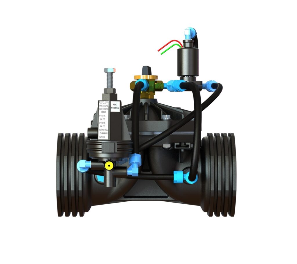 Es una válvula eléctrica de encendido/apagado, controlada por una electroválvula de plástico de 3 vías. Cuando se activa la electroválvula y la presión supera la presión mínima preestablecida, la válvula se abre gradualmente y mantiene la presión aguas arriba, independientemente de los cambios de caudal. El piloto de plástico de 3 vías puede preajustarse a la presión aguas arriba mínima deseada.